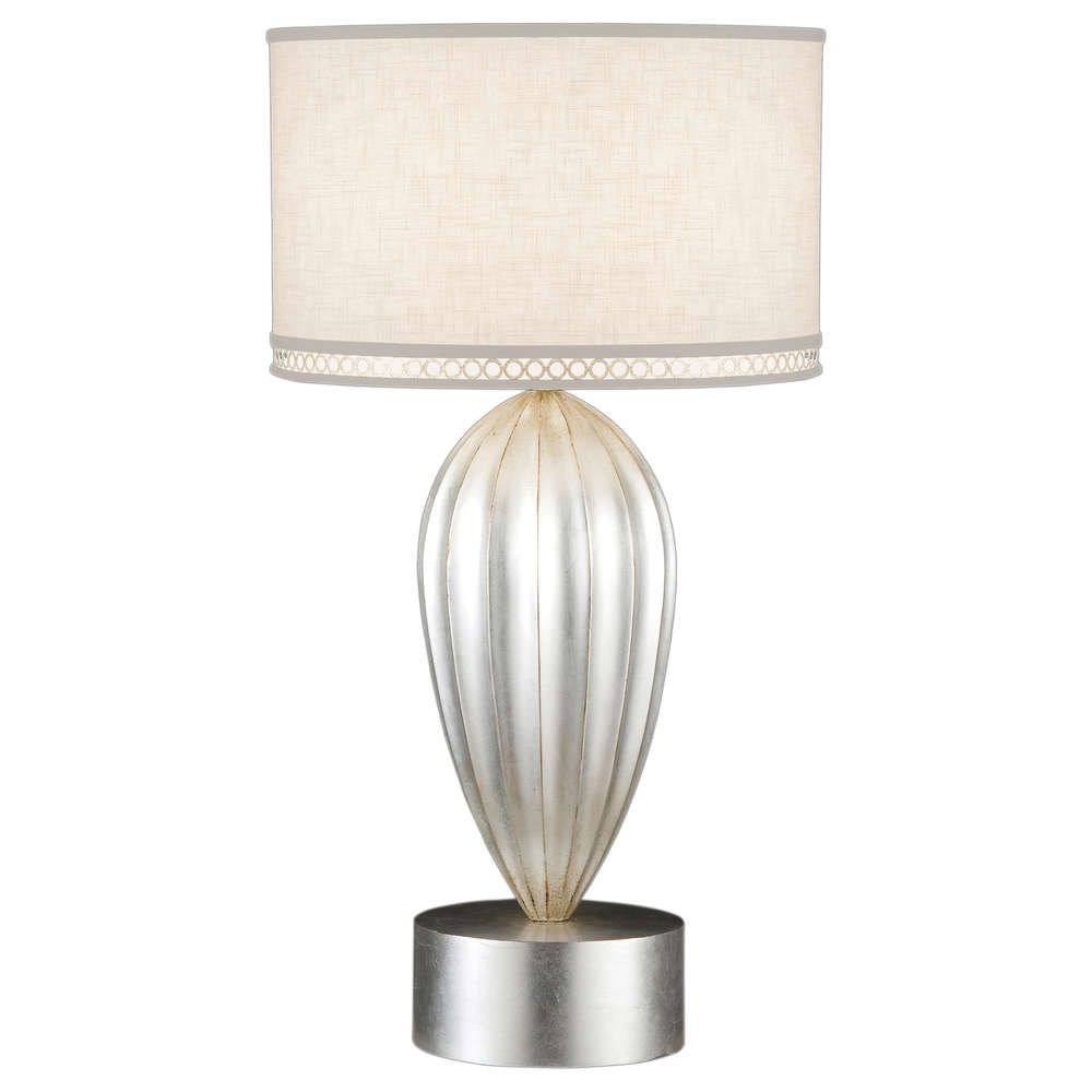 Table lamp in a platinized silver leaf finish with subtle brown highlights and white textured linen shade with pierced metal gallery in matching silver leaf finish.