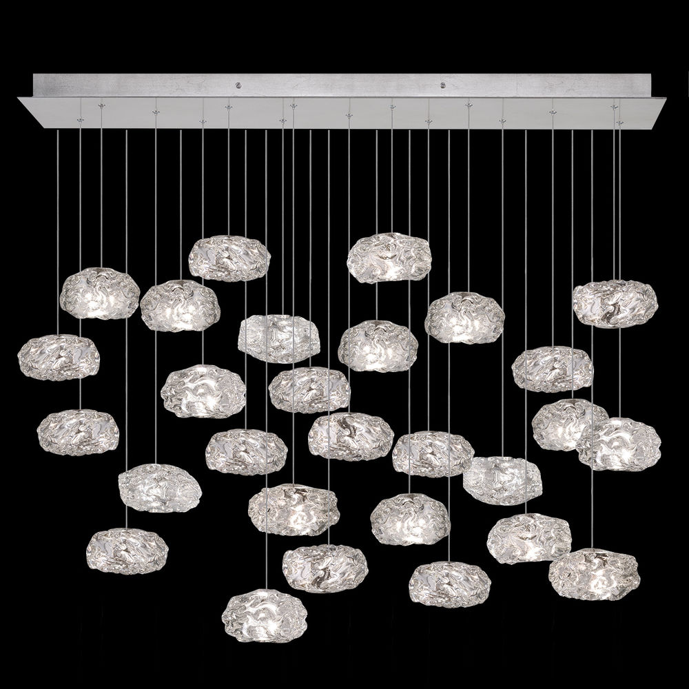 Master glass artisans blend quartz with other minerals to create Clear Quartz glass drop pendant with platinized silver leaf canopy. Also available in gold-toned silver leaf with choice of additional crystal glass options.Does not include transformer. Remote transformers to be provided by installer. This item is a "UL recognized" component to be used in a custom installation. For 220V, item is configured with halogen G4 bulb(s).