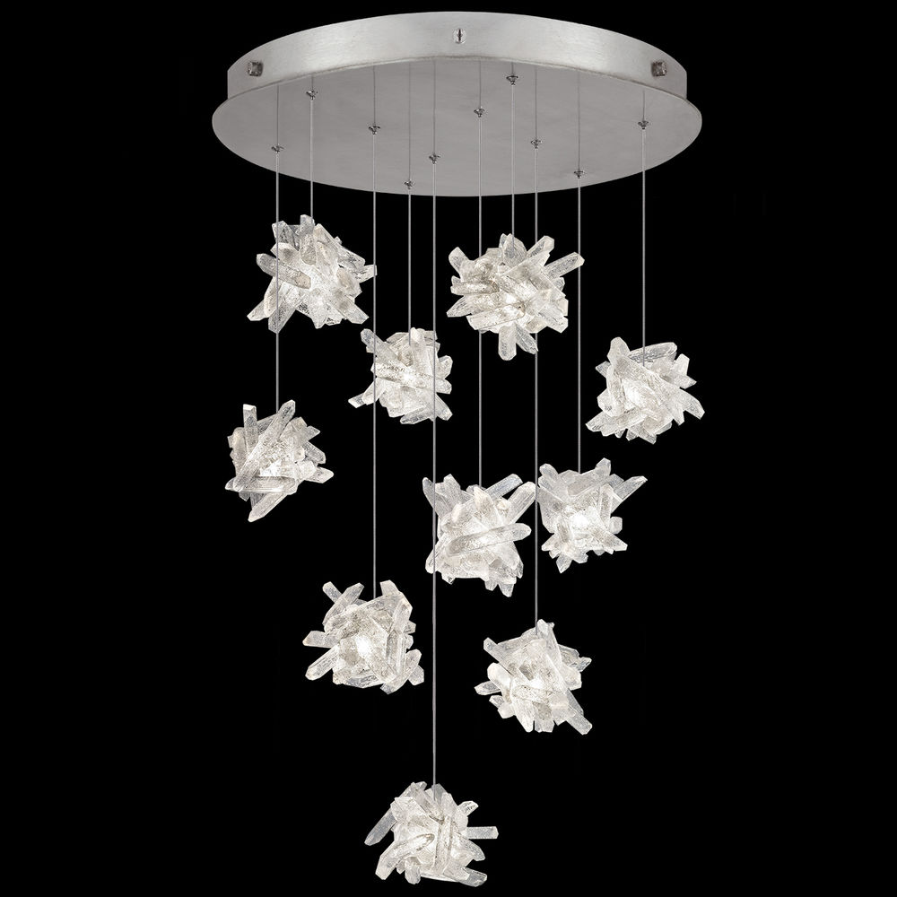 Master glass artisans blend quartz with other minerals to create unique Quartz Clusters" for our glass drop pendants. Platinized silver leaf canopy. Also available in gold-toned silver leaf with choice of additional crystal glass options.Does not include transformer. Remote transformers to be provided by installer. This item is a "UL recognized" component to be used in a custom installation. For 220V, item is configured with halogen G4 bulb(s). Natural Inspirations 5.5" Round Drop Light.