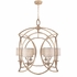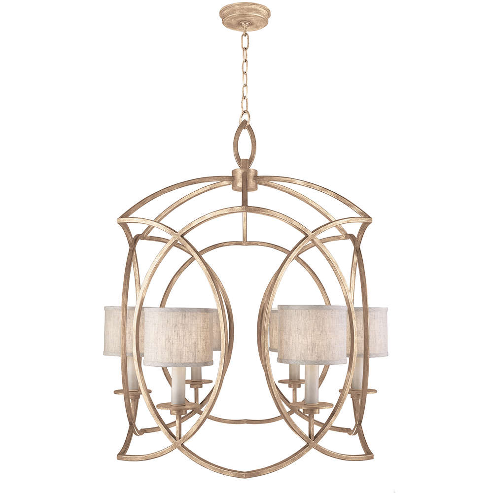 Executed by skilled metal artisans, this varicolored gold chandelier is inspired by the 1920Ős unique transitional period in architecture & design in Cienfuegos. Also available in weathered greige patina or antique bronze. Includes textured natural greige fabric shades.
