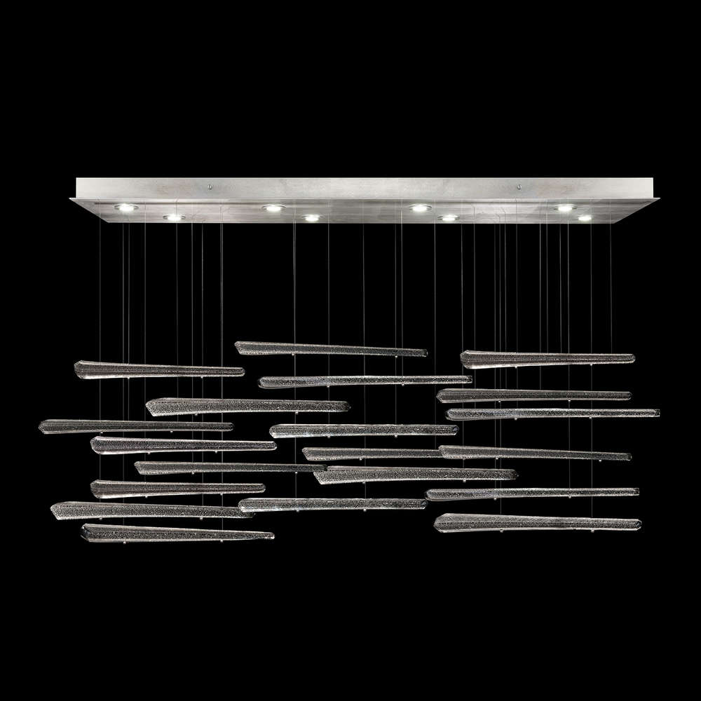 Elevate raises your environment to new heights. Each Ebony Stardust glass spire is hand sculpted with solid ebony crystal and surrounded by a clear crystal casing. Illuminated from a silver leaf canopy and suspended by adjustable cables, this Made in America rectangular fixture features 20 sculpted spires and is ideal for low ceilings. Shown in a ÒhorizontalÓ design.