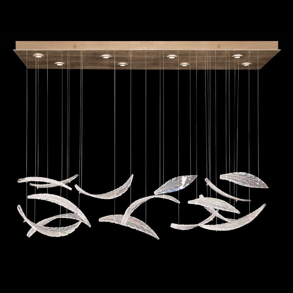 Elevate raises your environment to new heights. Each "plume" is handblown and sculpted with a translucent mixture of clear crystal and opaline glass accented by our signature dichroic glass, creating a shimmer of color in each ray of light. Illuminated from a soft gold leaf canopy and suspended by adjustable cables, this Made in America rectangular fixture features 15 handblown glass "plume"s and is ideal for low ceilings. Shown in a ÒhorizontalÓ design.