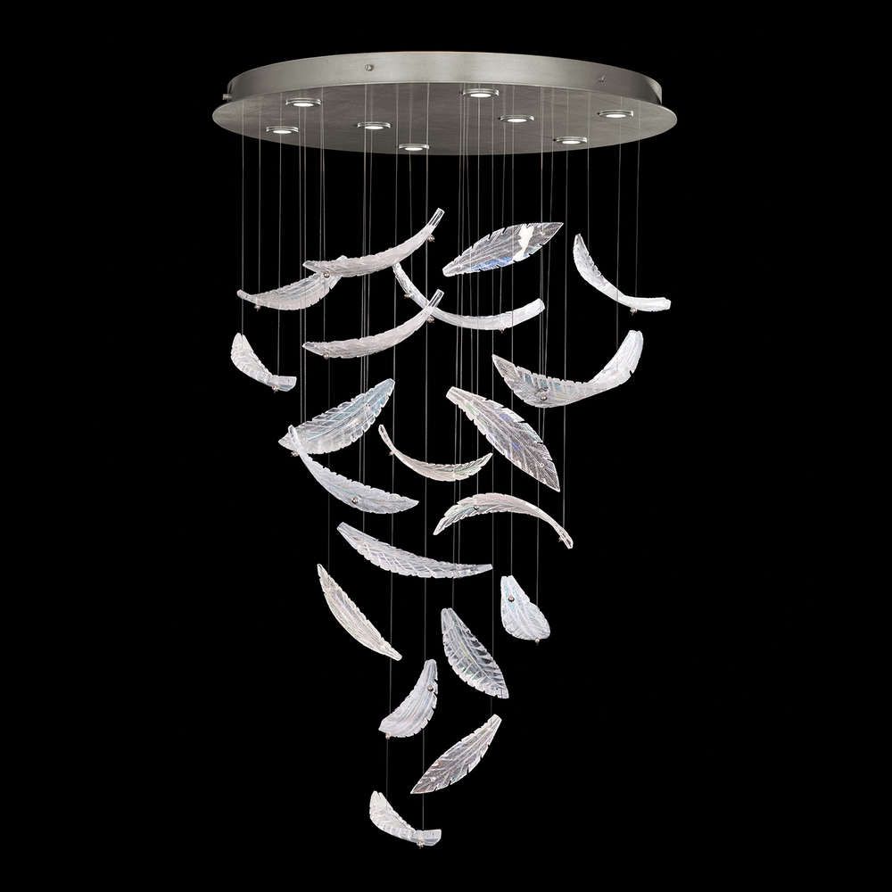 Elevate raises your environment to new heights. Each "plume" is handblown and sculpted with a translucent mixture of clear crystal and opaline glass accented by our signature dichroic glass, creating a shimmer of color in each ray of light. Illuminated from a silver leaf canopy and suspended by adjustable cables, this Made in America round fixture features 20 handblown glass "plume"s and is ideal for high ceilings.