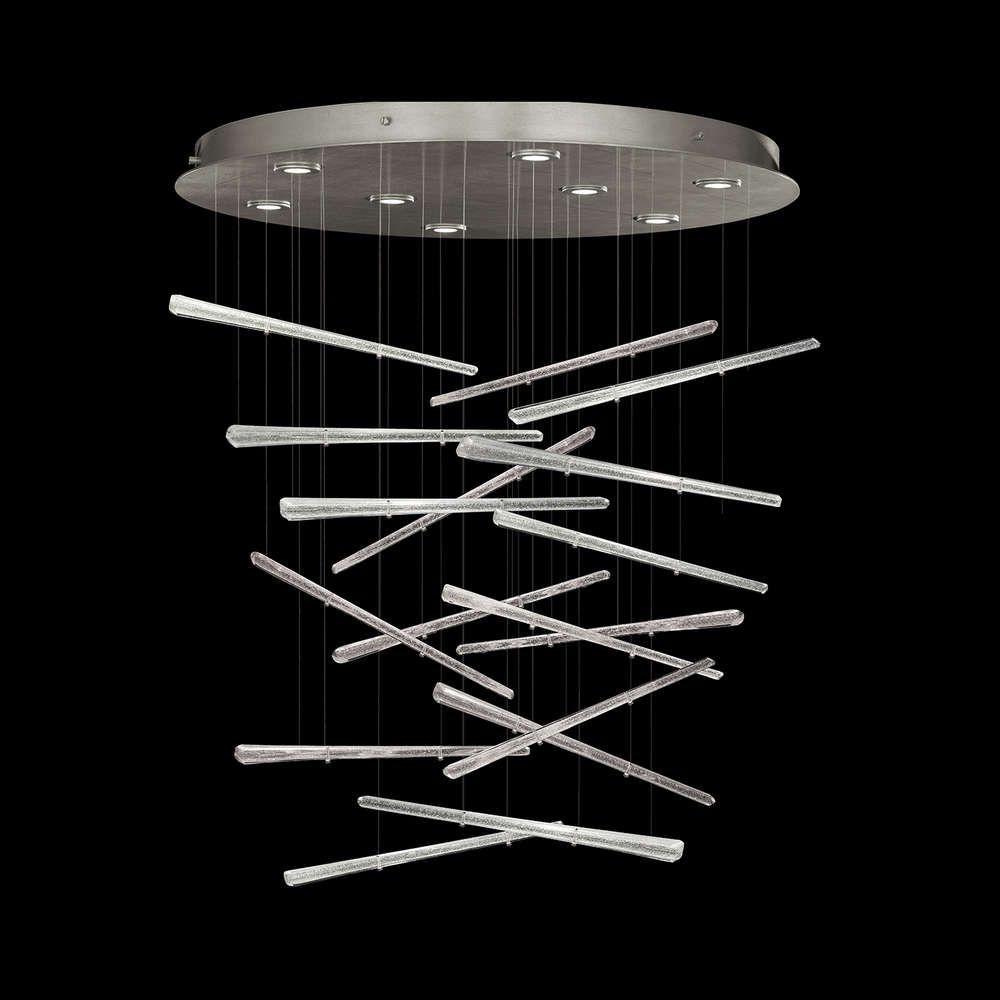Elevate raises your environment to new heights. Each Crystal Stardust glass spire is hand sculpted with translucent clear crystal and surrounded by a clear crystal casing. Illuminated from a silver leaf canopy and suspended by adjustable cables, this Made in America round fixture features 17 sculpted spires and is ideal for low ceilings.