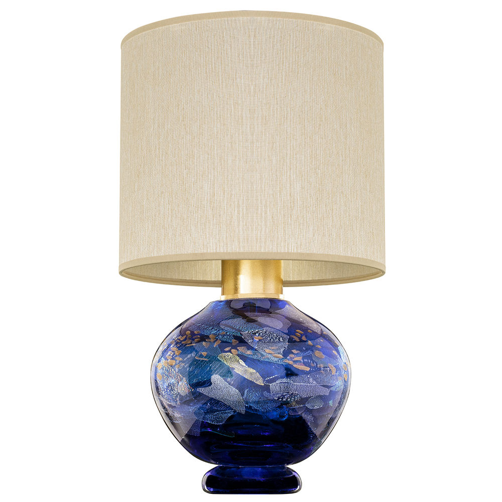 Our Dichro Collage lamp is a work of art. A trend setting innovative design born in our Miami Glass studio features a unique multi-color collage of luminescent abstract patterns with gold leaf accents. Created by fusing layers of dichroic glass into a blown vessel and cased in heavy clear crystal. Shown in cobalt with matching fabric shade. Also available in amber, black and ruby with coordinating or neutral fabric shades. SoBe 20" Table Lamp.