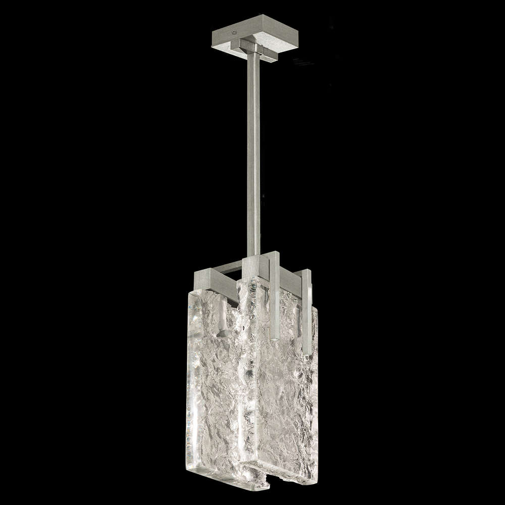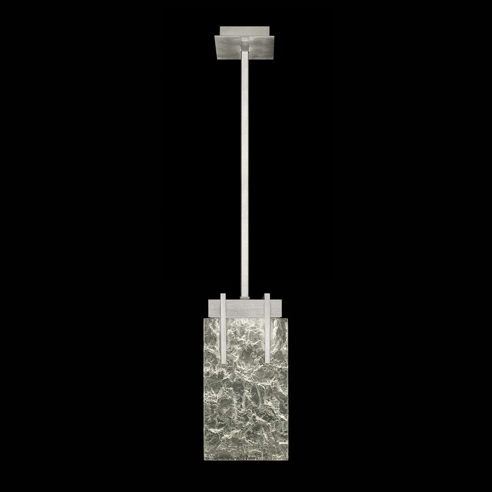 LED pendant featuring highly polished parallel forms of rich textured, hand-cast crystal in a clear or Gold Leaf choice. All available in three standard finish options, Soft Gold Leaf , Silver Leaf, or Black Iron. Shown in Silver Leaf with clear glass.
