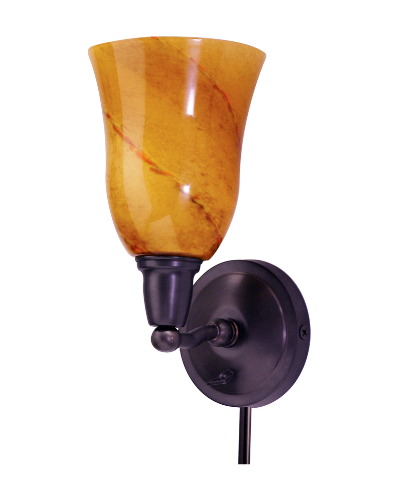 The HP775-OB-AG Hyde Park Sconce Oil Rubbed Bronze w/Art Glass uses 1 (60W Type A Incandescent) bulb that is not included. The height is 11 inches it extends 7 inches and it's backplate or base is 5 inches. The switch is located full range dimmer. This Wall Lamp comes in Oil Rubbed Bronze, weighs 8 pounds, and is made in US. This item can be Title 20 compliant by purchasing the Title 20 compliant bulb with purchase for and additional $3
