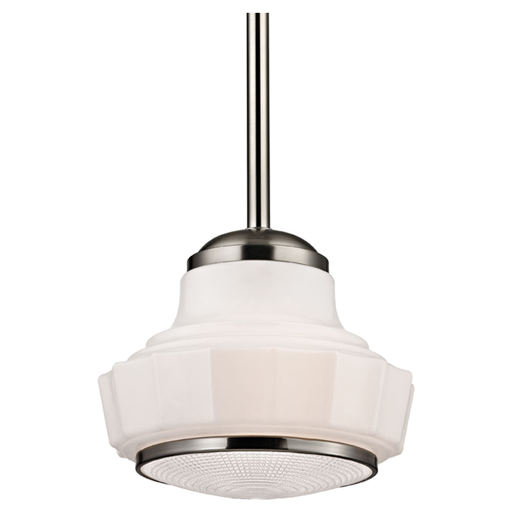 As population swelled, early twentieth century America saw a rapid expansion of public spaces. Savvy developers gained the edge with standout lighting designs bright symbols of technology and progress. Showcasing a multi-faceted shade of glossy, mouth-blown opal triplex glass and a prismatic down-light diffuser, Odessa brings the eye-catching innovations of a bygone era to your current standout space.