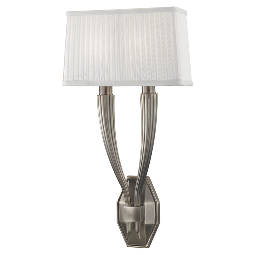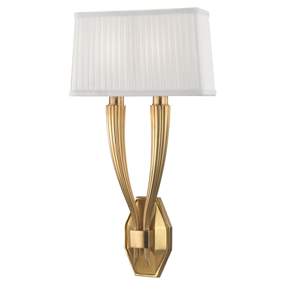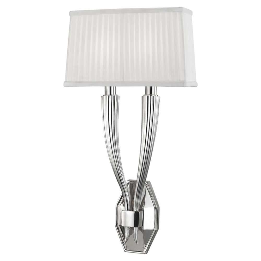 Stunning in its details, Erie pairs an octagonal, faceted backplate with tapered, ribbed arms. Organic shapes are offset by simple details, like the band that appears to clasp the arms and the smooth candle holders. The curved arms are topped with a pleated silk shade that perfectly diffuses the light.