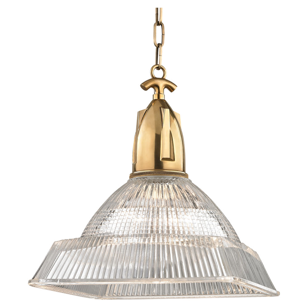 Corners and curves contrast in this striking pendant. The classic shape of the prismatic diffuser is reminiscent of factory lights during America's industrial era. A thick, stepped canopy and robust, nautical holder add texture and intrigue. With glass that is both lattice- and lateral-cut, domed and diamond-shaped, Langdon will add character to any room.