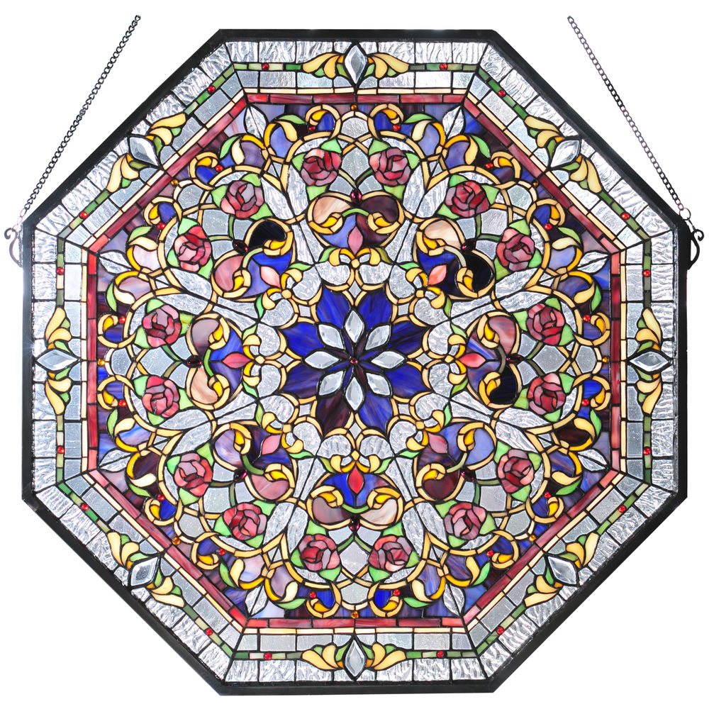 A magnificent octagon shaped stained glass window features various symmetric design repeats that branch out from a Cobalt/Plum colored eight-petaled flower in the central medallion. Victorian styled floral motifs with Roses blossom from natural Green Leaves and Beige with Gold accents among fanciful scroll and tilework borders in Dusty Rose; Leafy Green; Rosy Red; and Clear Iridescent on a Clear Ripple glass trim. The stained glass window was created using Meyda's famous copperfoil construction method. The window features an Antique Brass finished frame and includes hanging chains.