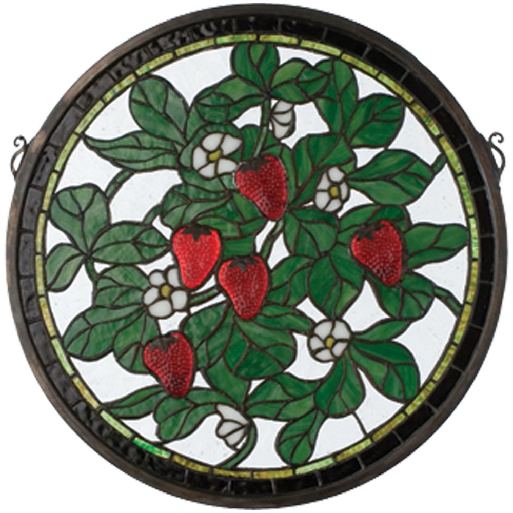 Luscious Red cast glass Strawberries glisten from the light on this charming Strawberry patch stained art glass window. The Meyda Tiffany original window has a clear textured background; with Heather Green leaves and tiny White flowers. Brass mounting bracket and chains are included.