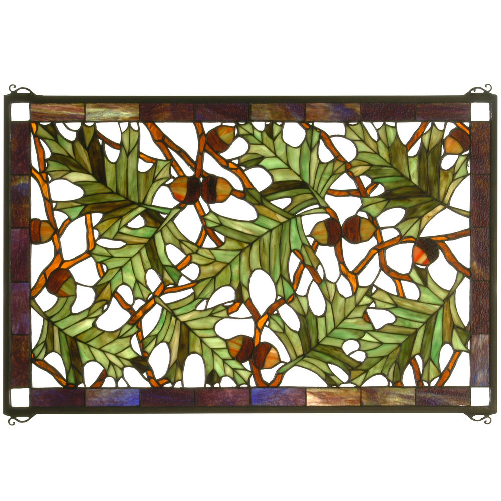 Invite the splendor of Brown and Green Acorns and Oak Leaves in this spectacular and intricate stained glass window; bordered in Root Beer colored glass. Hundreds of pieces of art glass are individually hand cut and hand set by Meyda artisans using Tiffany's famous copperfoil process.