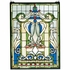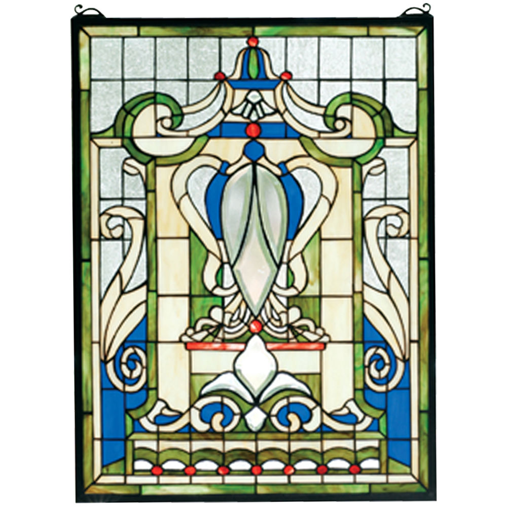 A Clear beveled shield and fleur-de-lis emblazon this regal window of 386 pieces of hand cut Royal Blue; Wheat; Sage Green and Clear stained art glass. Handcrafted utilizing the copperfoil construction process; this Tiffany style window also comes with a solid brass hanging chain and brackets.