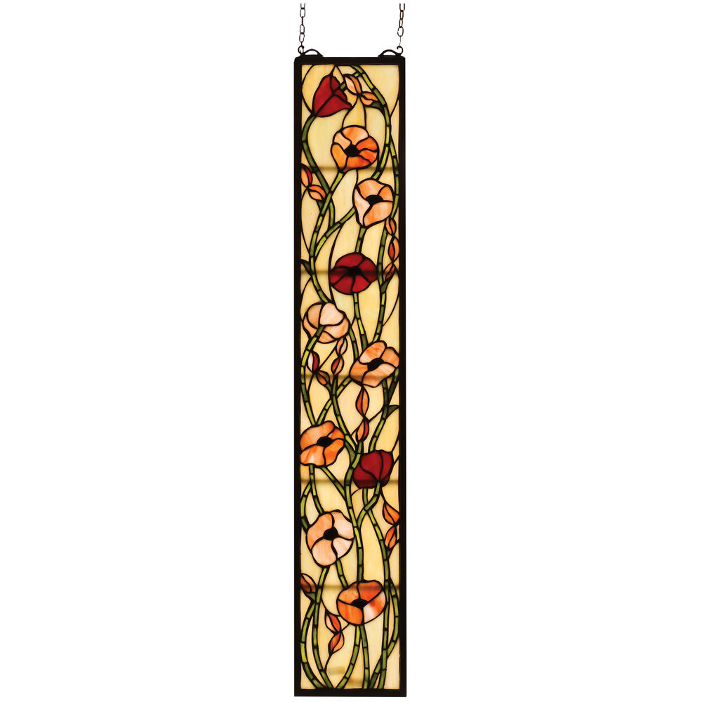 Reminiscent of a windswept garden on a warm summer day; this Poppy stained glass window will lighten up any room. Colorful petals of Yellow; Orange and Red with Green stems and Leaves on a Beige background; this window shouts happiness and laughter. This charming window was created using Meyda Tiffany?s famous copperfoil construction process. This work of art is featured in a solid Antique Brass frame and includes mounting brackets and hanging chain. If you really want to bring the warm days of summer into your house all year round; pair a few of these as sidelight windows; using model 144583 as the Transom Window for a stunning door surround that will be sure to attract attention.