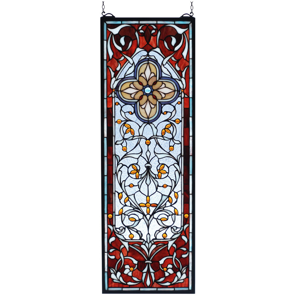 Delicate leaves and vines surround a four petaled medallion made of 454 pieces of hand cut Pomegranate and Frosty Blue stained art glass with flourishes of Wispy White and 27 Amber glass jewels flowers. Handcrafted utilizing the copperfoil construction process; this Tiffany style window also comes with a solid brass hanging chain and brackets