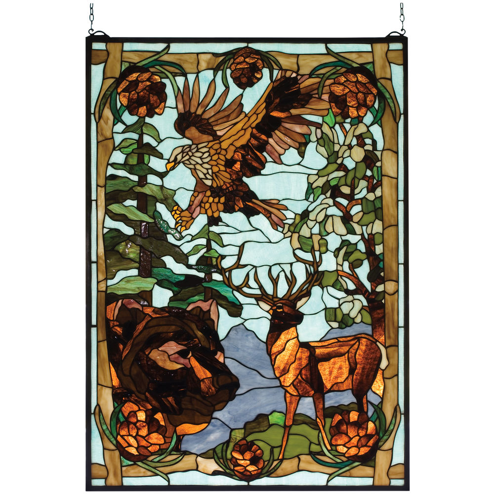 A majestic Bronze eagle soars above a Brown bear and deer against a Blue Sky in a picturesque woodland setting of Pine Green and Earth Brown framed in Branches and Pinecones. This handsome window is handcrafted utilizing the copperfoil construction process and stained art glass encased in a solid brass frame. Mounting bracket and chain are included.