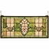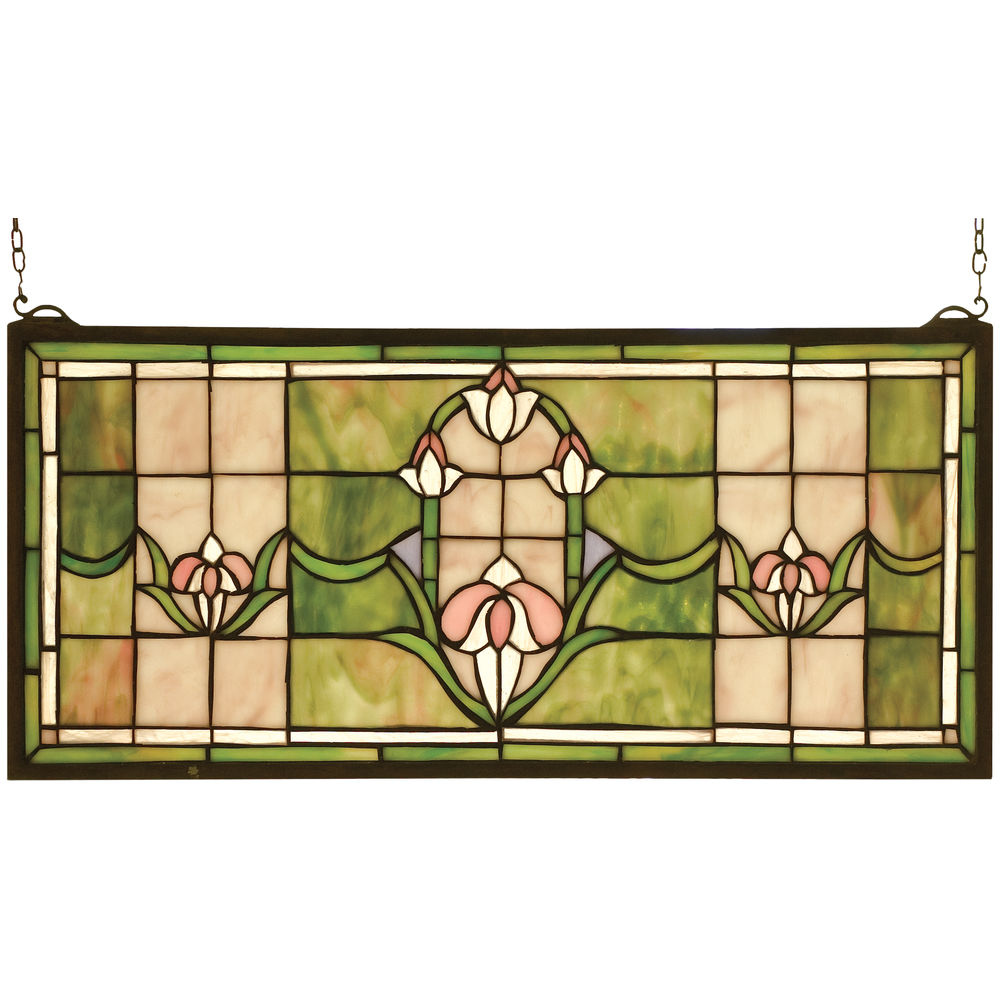 Stylized Tulips adorn this Peach and Avocado stained glass window. The window is handcrafted utilizing the copperfoil construction process and 159 pieces of stained art glass encased in a solid brass frame. Mounting bracket and chain are included.