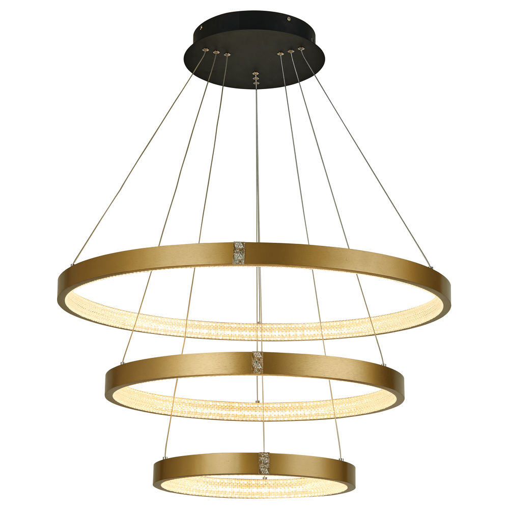 Kinsley collection in Brushed Gold illuminates with faux crystal accents, 3 tiers. 110W LED, 3000K integrated bulbs 80+ CRI, 9900 Lumens. Adjustable heights upon installation, dimmable with Triac dimmers. 5 year warranty.