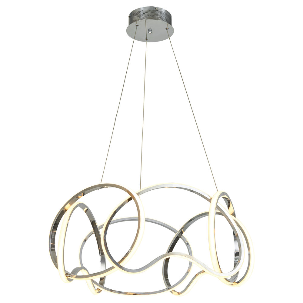 Irvine collection in Chrome has illumined whimsical lines. 40W LED, 3000K integrated bulbs 80+ CRI, 3600 Lumens. Adjustable heights upon installation, dimmable with Triac dimmers. 5 year warranty.