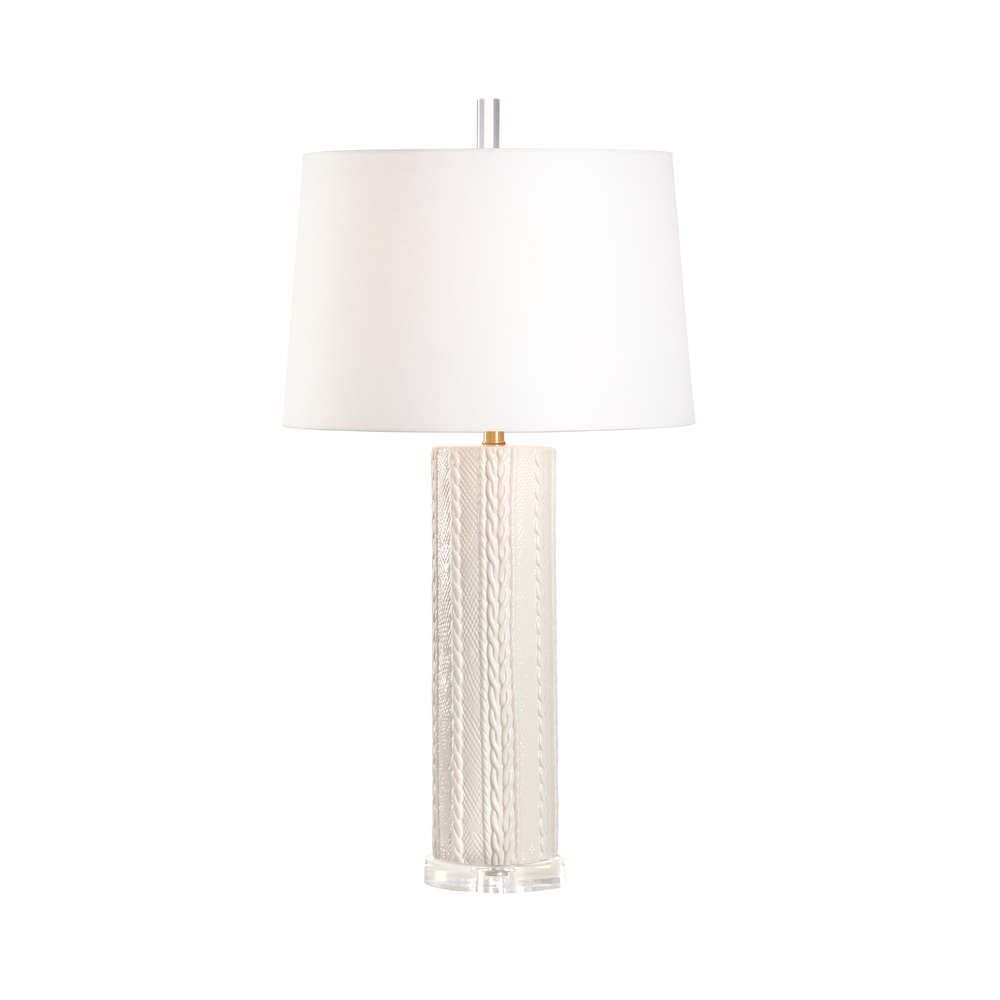 Knit pick lamp, part of the Cheryl Luckett collection for Wildwood, was inspired by a warm, cozy cable knit sweater. This white glazed ceramic body features an eye catching texture with clear acrylic base and finial. Topped with an off white linen shade, this versatile accent lamp is ideal for bedrooms and living spaces in a traditional or transitional home.