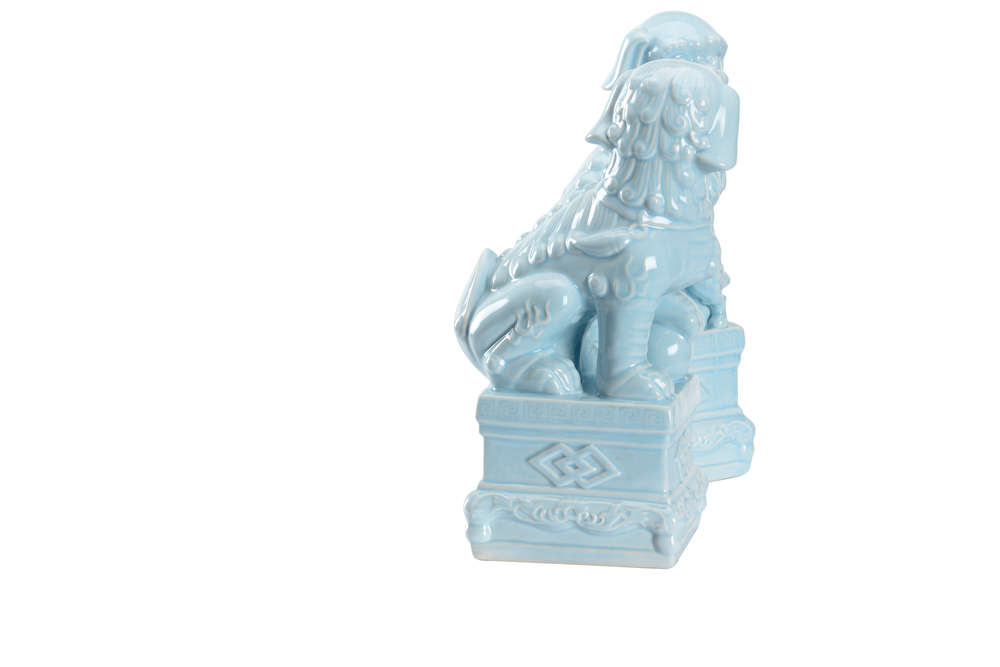 Known as guardians of the palace, foo dogs or Chinese guardian lions ward off evil and symbolize prosperity for the future. On tabletops and in bookcases, this pair of Hawaiian Breeze blue glazed foo dogs will add color and tradition into any decor.