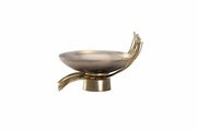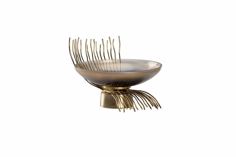 Introduce an artistically creative finishing touch to tabletops or shelving in any space. This rustic modern design features a shallow bowl crafted of colorful art glass with gold strands of aluminum conveying movement. A cylindrical foot elevates the bowl from the tabletop.