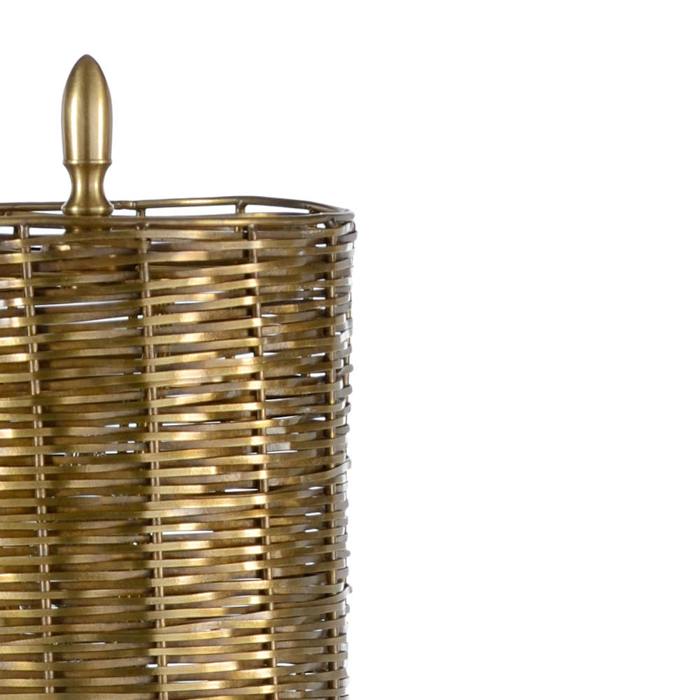 Enhance the modern aura in your home with Milo Lamp. Perfect for a small space, this brass lamp features a minimalist design with an intricate shade. The simple brass column is supported by a natural black marble base and is topped with a woven tarnished brass finished metal shade (Shade: 5"d x 5.5h)