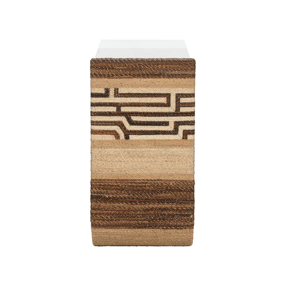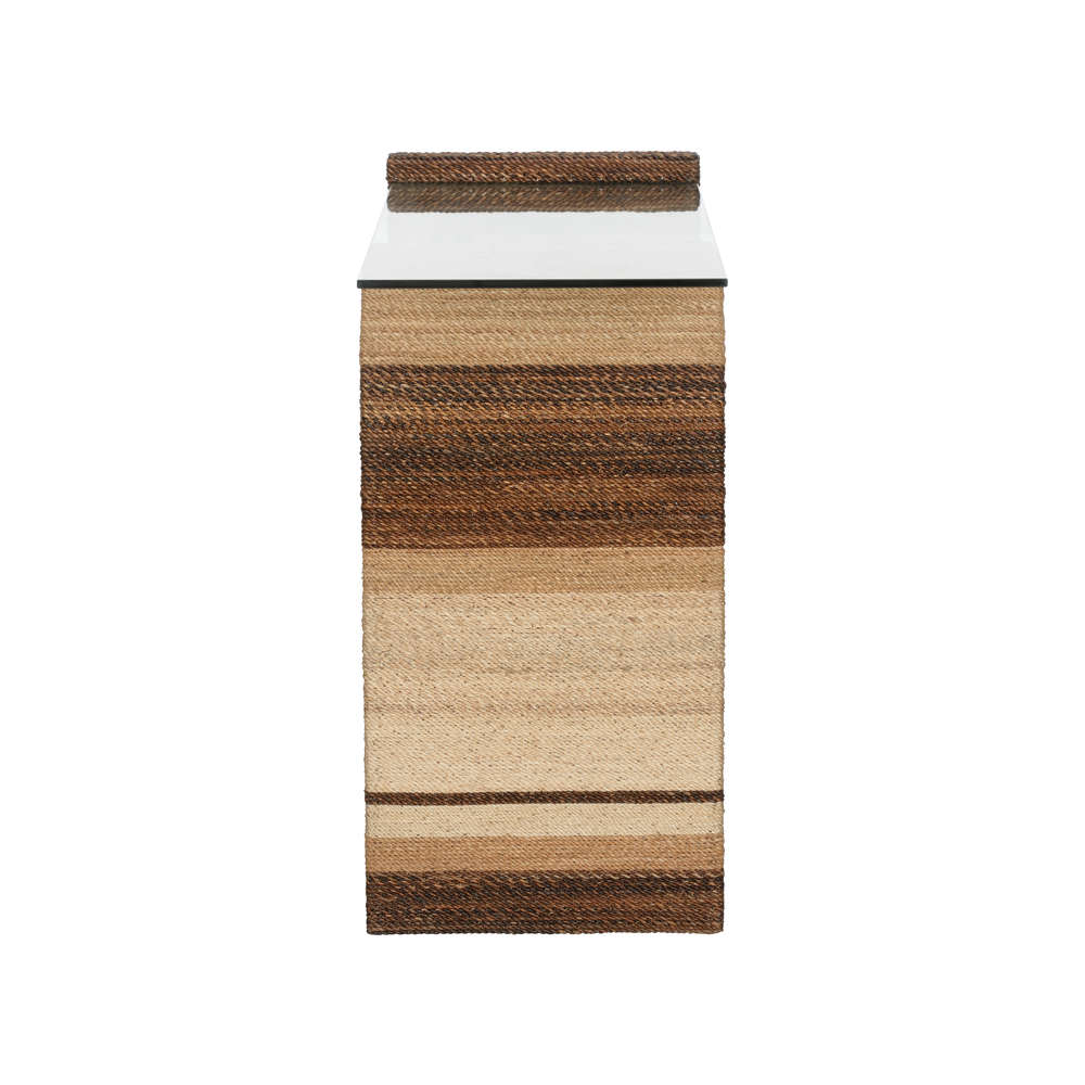 In perfect asymmetry, the Calusa Curve Console Table exudes natural style with its wrapped abaca rope base and suspended tempered glass top. The dyed rope creates a captivating pattern and texture, perfect for a kitchen or dining area.