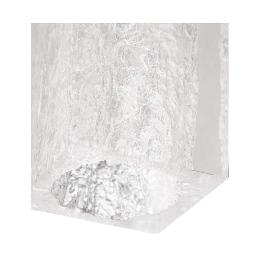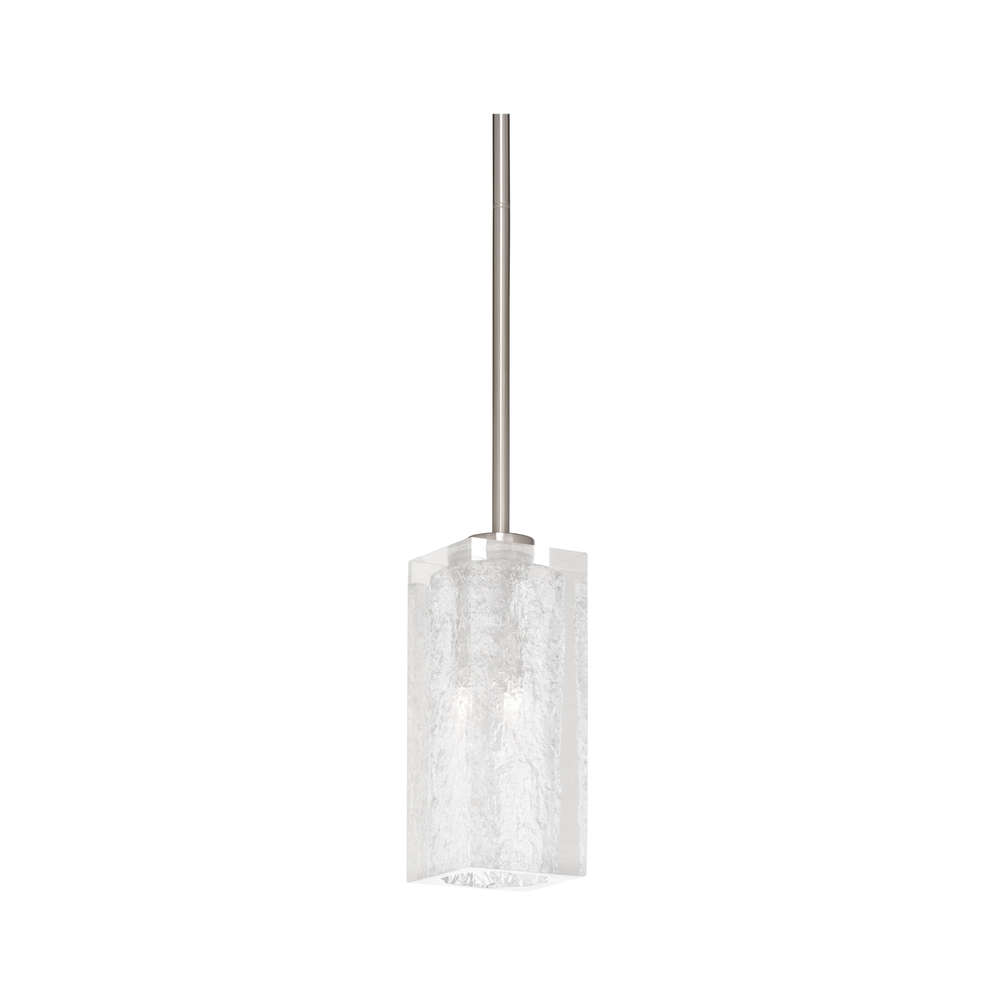 Lucallan pendant provides ambient light to your decor with its one candle socket set in an ice textured block of acrylic. Hanging from a satin nickel finished rod, this modern pendant is at home, alone or in pairs, over a bar, island or breakfast nook.