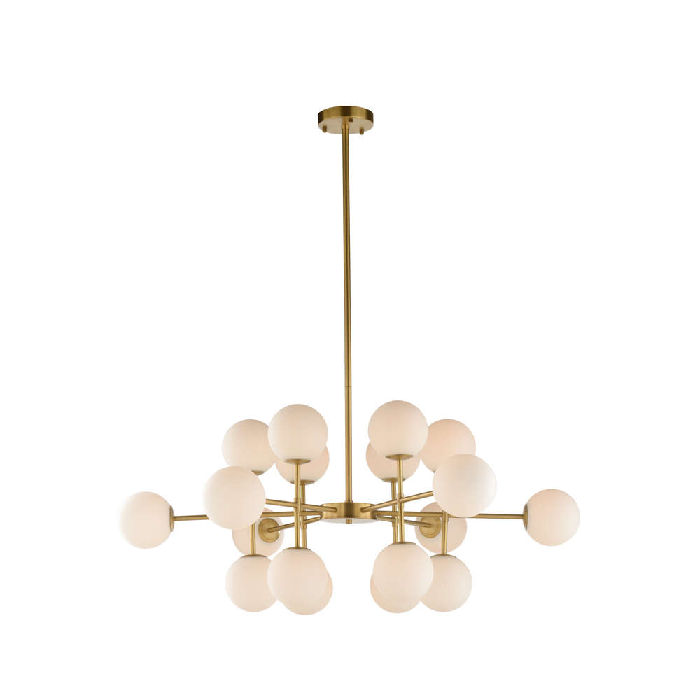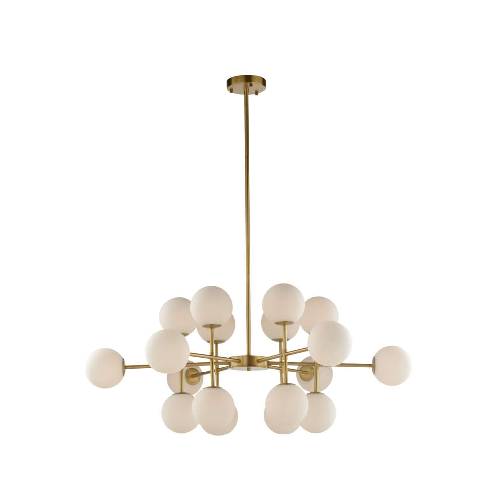 The Rue Saint-Anne Chandelier is a stunning centerpiece that combines mid-century modern design with a touch of vintage sophistication. Featuring an array of milk glass globes branching out from an antique brass frame, this chandelier radiates a soft, warm light that adds a luxurious glow to any room. Its geometric arrangement of globes creates a striking visual impact, making it the perfect statement piece for living spaces, dining rooms, or grand entryways. Comes with 1', 2' and 3' rods.