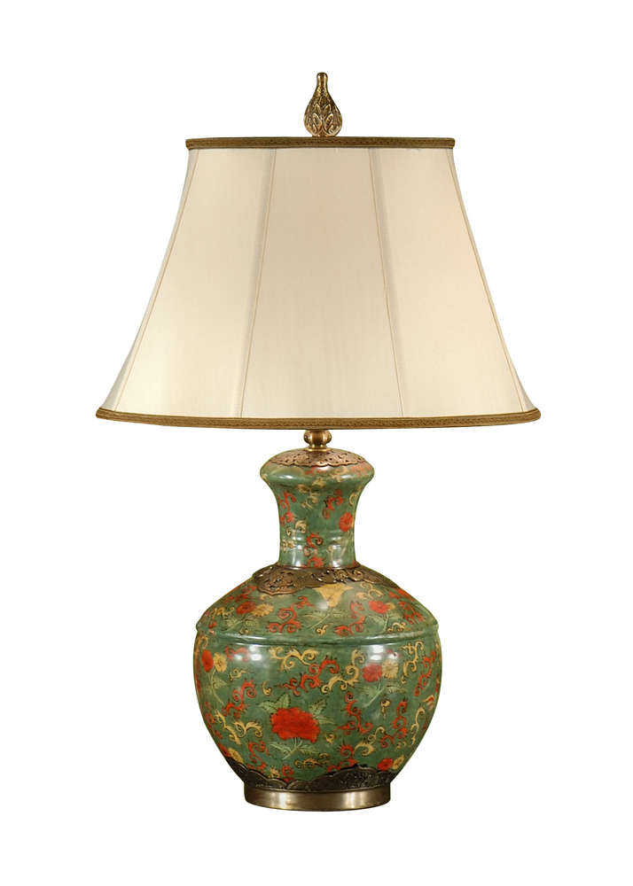 : Green Dragon with Red Lamp Dimensions: Height 26" (65 Cm) Bulb Type: (1) 100 Watt Maximum Standard Medium Base Switch Type: Three Way Shade Number: 189324 Shade Size Top: 9 inches Shade Size Bottom: 15 inches Shade Size Side: 10 inches Shade Color: Ivory Shade Fabric: Silk